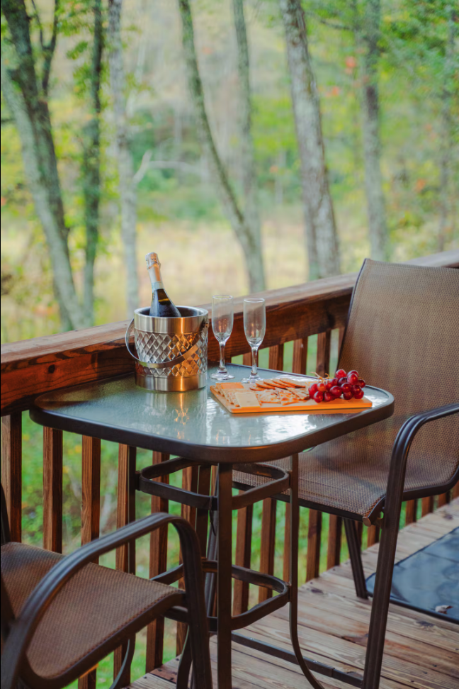 - Outdoor griddle with utensil caddy and dining setup, also overlooking the forest. Please bring your own propane tanks - available at gas stations in Laurelville or Rockbridge.