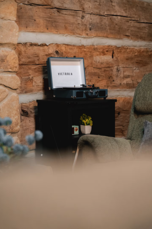 - Cozy living area with Smart TV, Vinyl Record Player, and a wood-burning fireplace overlooking the foothill woodlands.