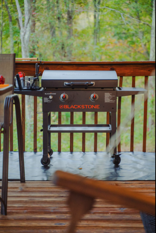- Outdoor griddle with utensil caddy and dining setup, also overlooking the forest. Please bring your own propane tanks - available at gas stations in Laurelville or Rockbridge.