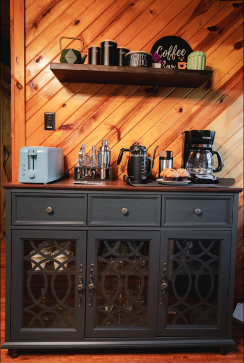 - Coffee station stocked with essentials - toaster, blender, coffee maker, French press, electric kettle, and a variety of cookware.