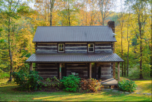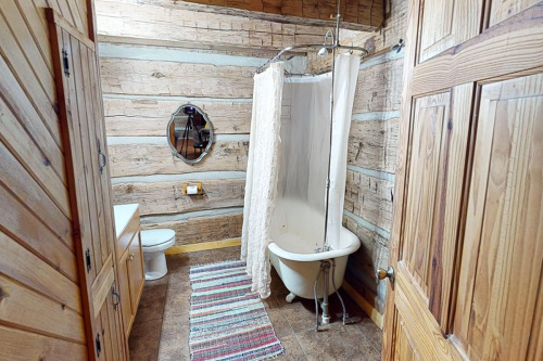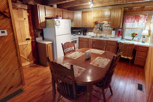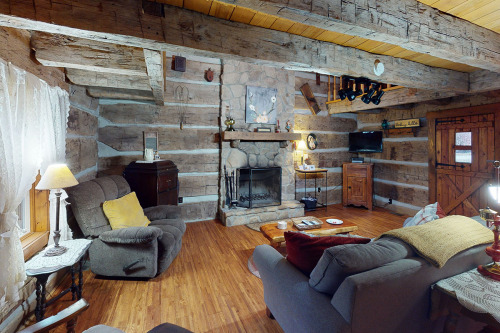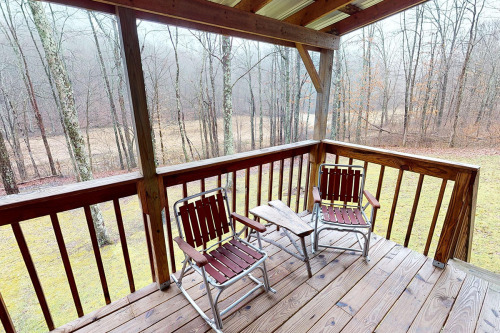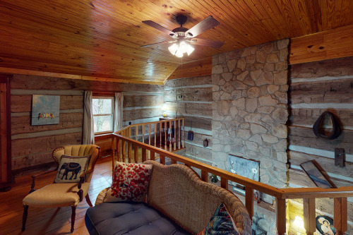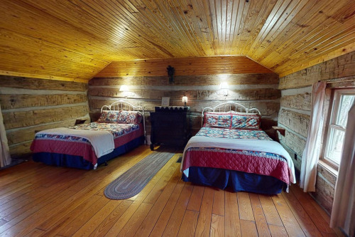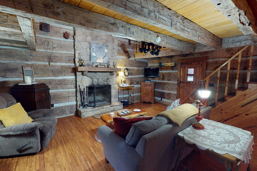Cabin#2 This cabin has two queens in the loft, Stone woodburning fireplace, Pool table, dart board, horse shoe pit, fire ring. 2 baths, all essentials supplied. Sets by itself. Very Private. Hot-tub Large porch with swing,& rockers, Covered deck.